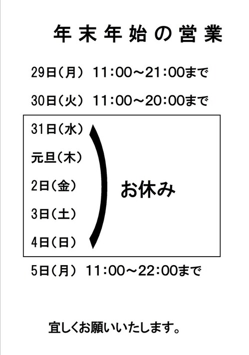 平日・土曜 11:00~22:00 / 日曜・祝日 11:00~21:00